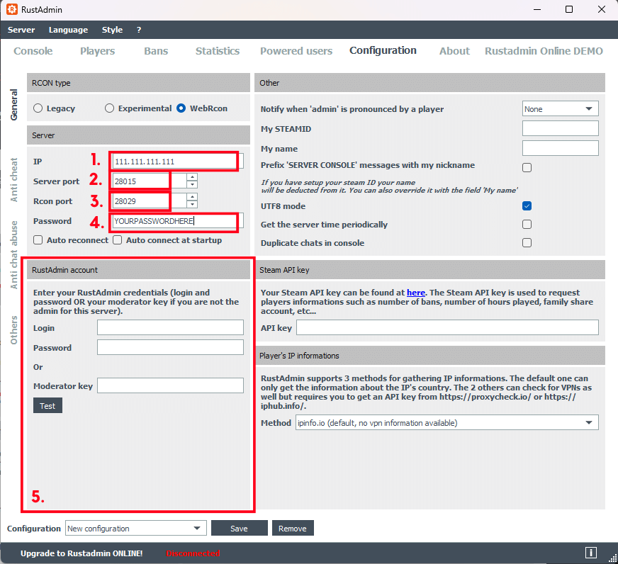 RCON portto the value in theRCON Portbox found while enabling RCON on your Rust server. - Set